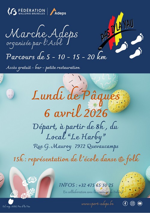 Robert Ayotte Nous sommes heureux de pouvoir réorganiser notre marche Adeps cette année ☀️🌳🚶‍♂️ Rendez-vous le lundi 18 avril pour une marche plus propre ! 📌 Local « Le Harby » rue Georges Mauroy, 7972 Quevaucamps ⌚️ 8h à 18h 🚶‍♂️ 5km – 10km – 15km – 20km 🍴 Petite restauration sur place 🎶 Nos amis musiciens assureront l’ambiance musicale. En partenariat avec les Points verts de l’Adeps et après une phase de tests en 2019, Be WaPP a lancé le concept de « Marche Plus Propre »! Depuis janvier 2020, sur certaines marches Adeps identifiées, les marcheurs auront la possibilité de ramasser les déchets se trouvant le long de leurs parcours. Pour cela, du matériel réutilisable leur sera gracieusement prêté par les organisateurs. Nous proposons le concept cette année lors de notre marche ! Venez donc nombreux pour contribuer à un environnement plus propre ! Renseignements : Robert Ayotte 0476 / 29 92 39
